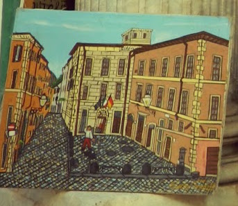 Si parla tanto di street art e di riciclo, argomenti che fanno tanto politically correct chi li usa, ripari che servono a fare giusti chi mastica accoglienza, antirazzismo e lotta contro la povertà. Se passi al ghetto, in una tra le vie più nobiliari, con palazzi che traboccano arte, come palazzo Lovatelli famoso per le aste, palazzo Caetani o quello della biblioteca americana, palazzo Antici Mattei costruito da Carlo Maderno, pieno di antiche statue, sarcofagi, bassorilievi e ricchi reperti romani, potrebbe capitare di vedere come se fossero messe a ornamento sulle gradonate di Santa Maria dei Funari luminose raffigurazioni di frutta che creano sorpresa se non sai che da anni un testardo e coraggioso signore si aiuta a sopravvivere facendo quadri che vende di mattina.