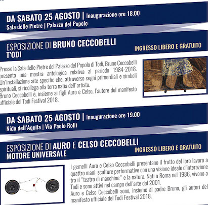 Non si poteva offrire di meglio da parte di questi tre artisti tudertini per il battesimo l’edizione 2018 di Todi Festival che da anni riesce con successo a essere riferimento culturale internazionale per volontà e impegno dell’associazione ‘Todi per l’Arte’ il cui Presidente Giuseppe Cerasa spiega: “Questo nostro progetto ha già visto la realizzazione di una serie di mostre di artisti protagonisti del panorama artistico nazionale e internazionale”.