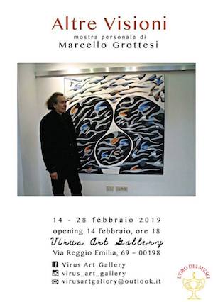 Nella galleria di Gabriella Perna, Virus Art gallery, di fronte il MACRO, sono in mostra 20 opere più una scultura di Marcello Grottesi, un artista pluridisciplinare di ben rodata carriera che ha iniziato in Francia a Nizza nel 1960.