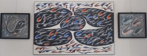 Non so se le mie impressioni coincidono con le idee dell’artista, ma nella sua pittura vedo ricorrere un connotato di piccoli esseri allungati in varie forme che si ritrovano in forme più grandi come se fossero uova informi che le contenessero. A guardarle hai una sensazione “germinale”specie se le metti in sequenza con le altre opere.