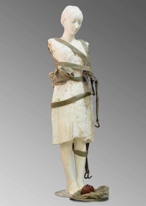 Ma è senza dubbio un esplicito richiamo all’antichità classica il gesto di porgere un’offerta, probabilmente un frutto di melagrana, per il suo significato di abbondanza e prosperità. Non è tutto invero citazione classica, specie negli abiti o panni che indossano le statue, perché lì vedi segni, fratture, corrosioni, ossidazioni e lacerazioni di un tempo che scorre inesorabile verso un'umanità distratta e ferita.