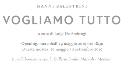 Con la collaborazione della Galleria Emilio Mazzoli di Modena, curata da Luigi De Ambrogi, Vogliamo tutto, mostra personale di pittura di Nanni Balestrini, al Visionarea Art Spacenel secondo piano dell’Auditorium Conciliazionesostenuta della Fondazione Cultura e Arte, ente strumentale della Fondazione Terzo Pilastro – Internazionale, presieduta dal Prof. Avv. Emmanuele F.M.Emanuele.