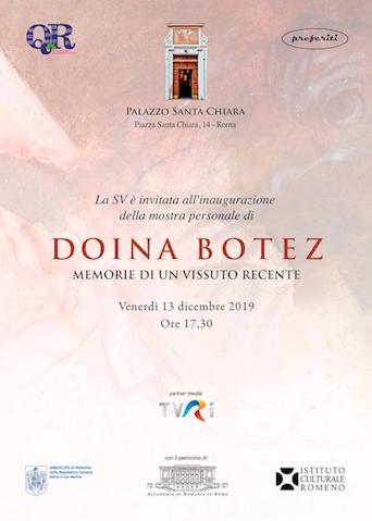Presso il Palazzo Santa Chiara (piazza S. Chiara, 14) a Roma, venerdì 13 dicembre 2019 alle ore 17.30, si terrà il vernissage della mostra di Doina Botez Memorie di un vissuto recente promossa dal Centro Studi Arte Contemporanea Preferiti e dalla Nuova Associazione Amici di Quaderni Radicali. La mostra è curata da Carla Mazzoni e Giuseppe Rippa.