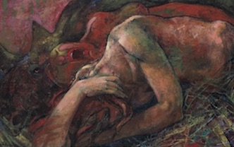 All’ingresso della grande sala di Palazzo Santa Chiara si notano delle splendide opere su carta dove le scolature e le tortuose pennellate di colore sul bianco candito offrono un contrasto incredibilmente equilibrato: si tratta de La rinocerontite ispirata a Eugene Ionesco, le metamorfosi apparentemente surreali che sfigurano l’uomo sotto il peso dell’autoritarismo e del totalitarismo. Qui si aprirebbe un altro capitolo che sarebbe troppo lungo, riguardo a Ionesco e al suo teatro dell’assurdo: consiglio pertanto di abbandonarsi al piacere visuale che offrono questi quadri, con particolare attenzione al grande quadro che primeggia nella sala, che da solo vale tutta una mostra. Parlo di Incubo, il grande acrilico del ciclo delle Ombre che più di tutti racchiude le angosce di Memorie di un vissuto recente, così recita il titolo assai appropriato che racchiude il tema portante della mostra.