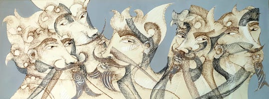Badate bene, anche se sembrano icone della Grecia arcaica o personaggi dei bassorilievi raffiguranti re assiri o babilonesi, non c’è niente di tutto questo: c’è solo la fantasia di un artista che con estro dinamico traccia decisi e veloci segni di pastello o di pennello come a renderli vivi da sembrare dialoganti con il pubblico.