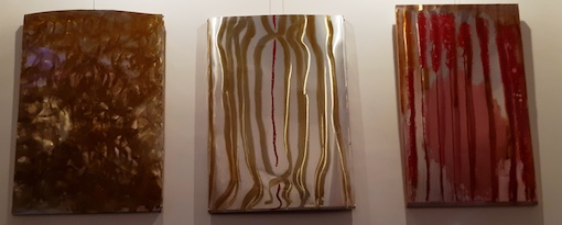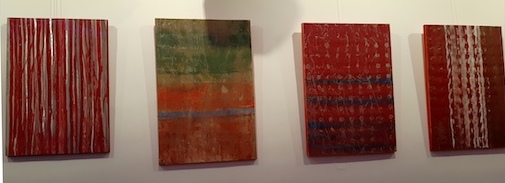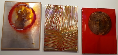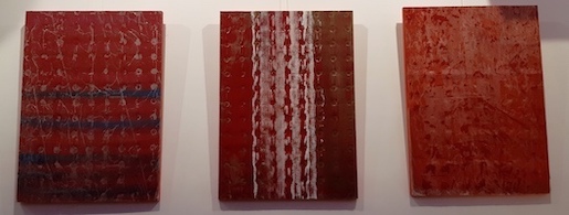 Sono opere raggruppabili in “generi” diversi, alcuni sono cartoni dai “segni regolari come un mantra” (B.P.) che scandiscono la forma e offrono quello che è l’attuale spazio-tempo. Altri sono acrilici sul legno, supporti in compensato marino, mentre altri ancora sono laminati metallici di alluminio abrasi e scalfiti e poi smaltati a caldo con resina epossidica trasparente in polvere e cotte in forno industriale, stanno come a replicare e ribadire l’identità, l’aderenza con il tecnologico che ci circonda, riproducendo una complessità con un gesto pregno di senso poetico.