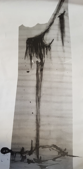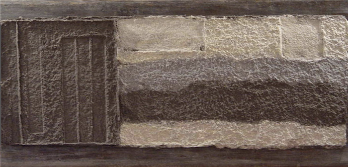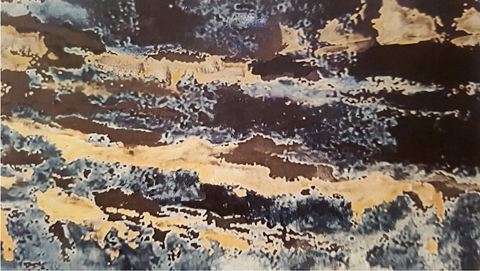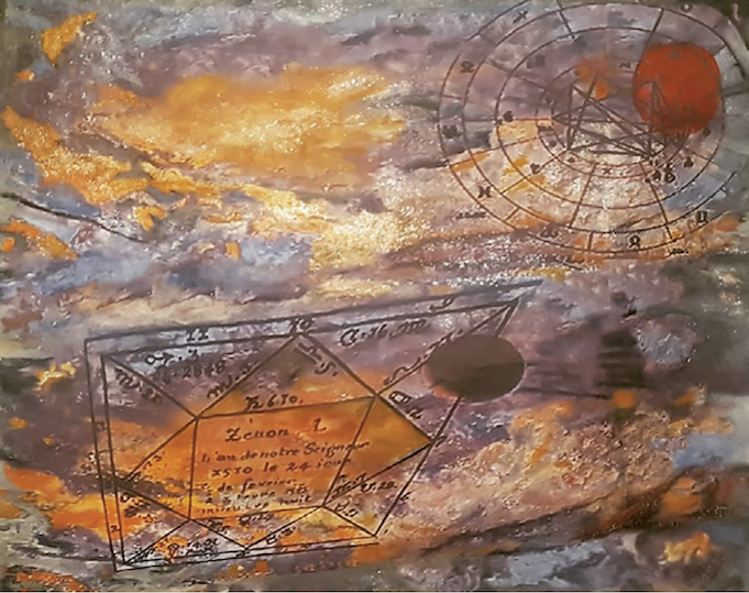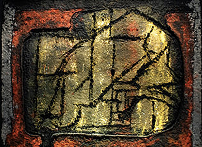 Laura d’Andrea rappresenta simbolicamente questa fase della nigredo con un’opera apparentemente astratta, in cui i colori utilizzati, il nero, il bianco, il giallo e il rosso, i colori simbolici della fase di trasmutazione alchemica, nell’opera ci appaiono come migliaia di piccoli atomi fosforescenti in movimento, solcati da grandi tracciati neri. L’artista ha completato la rappresentazione con l’installazione di un bassorilievo davanti al quadro, un bassorilievo composto di fili di rame e altri elementi a rappresentare i metalli utilizzati nella realizzazione della trasmutazione alchemica.