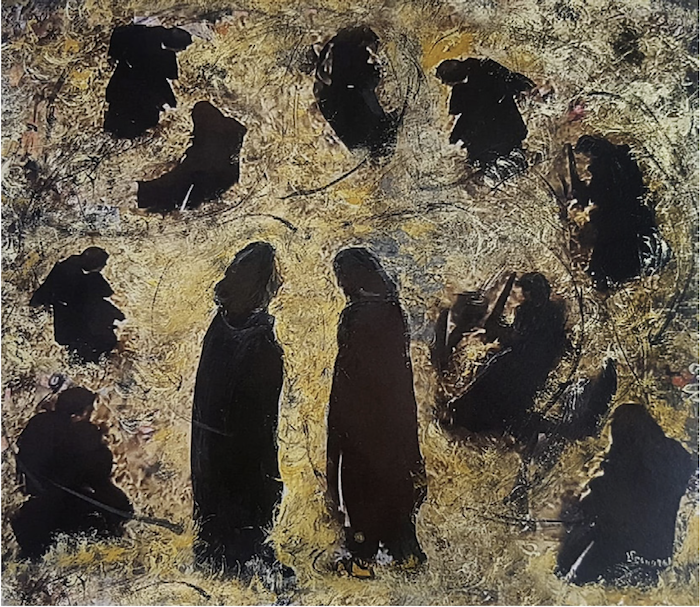 Bellissimo il dipinto che rappresenta Zenone con il frate Cipriani. Laura D’Andrea ha ritratto affiancati i due monaci avvolti nei loro mantelli scuri, su un fondo chiaro lavorato con pennellate veloci che trasmettono all’osservatore la sensazione di ondate d’aria in movimento vorticoso. I due monaci sono accerchiati da una miriade di fraticelli che, senza peso, volteggiano in cerchio nell’aria. Una danza che sembra un sabba, misterioso e forse osceno, di più non è dato sapere perché Laura D’Andrea ha voluto trattenere nella scena del quadro un’atmosfera sospesa non indugiando sui particolari. Il risultato dell’insieme è sorprendente, rimanda alla mente, mutatis mutandis, La danza, il celebre quadro del 1898 di Matisse, al Moma di New York.