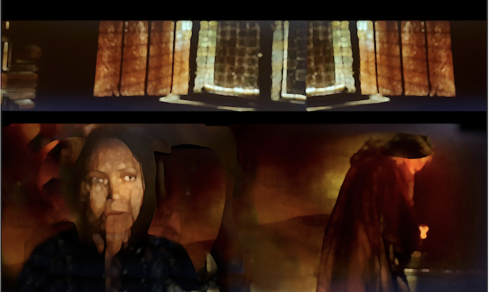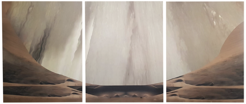 Nella grande sala espositiva attraggono l’attenzione tre pannelli, posizionati non in linea retta, ma un pannello è al centro e due sono ai lati a fare da quinte diagonali, così da formare un paesaggio entro il quale anche l’osservatore sembra potersi avventurare. Guardando il trittico colpisce la sensazione di uno spazio senza limiti, uno spazio che prosegue all’infinito oltre il quadro.Passeggiando tra queste dune dai riflessi lunari Zenone maturerà la difficile decisione di non sfuggire al suo Destino. Davanti al trittico è collocata un’altra raffinatissima opera di grande effetto nella quale il sonno di Zenone tra le dune, sonno di inconscia elaborazione di tutta una vita, viene immaginato e rappresentato come una miriade di sottili fili. luminosi che s’intrecciano nello spazio buio.