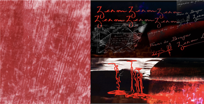 La morte di Zenone è rappresentata dalla D’Andrea con tanto rosso che dilaga e occupa metà dello spazio del quadro, nell’altra metà il fondo è nero, il nero della notte ed anche della nigredo che vediamo trasmutarsi nell’albedo rappresentato simbolicamente nel bianco della coperta stesa in terra a raccogliere il sangue di Zenone che cola in grandi rivoli. Il rosso rappresenta la fase finale nel processo alchemico.