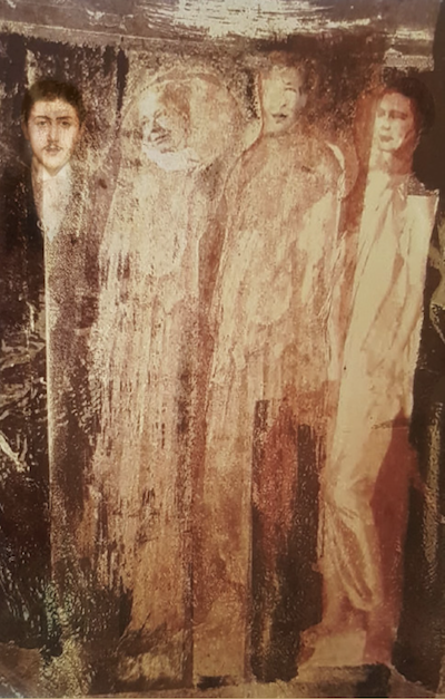 In tutti i quadri di questa mostra aleggia un’atmosfera particolare e direi che la caratteristica principale che li accomuna è la rappresentazione dello spazio, uno spazio inventato, a volte infinito senza limite, come nel dipinto della partenza iniziale di Zenone, a volte vorticoso come nel quadro degli “Angeli” o fraticelli in cerchio in volo, a volte stretto misterioso offuscato come nel Bagno delle delizie degli “Angeli”, a volte moltiplicato come nel dipinto con l’immagine della Yourcenar.