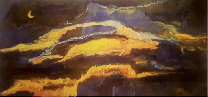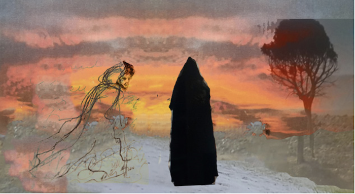 Laura D’Andrea ha dipinto l’inizio del viaggio di Zenone in un quadro di non grandi dimensioni ma molto simbolico. La luce di un’alba di fuoco e lo spazio senza confini che si apre davanti ai due viandanti, Zenone e il cugino Enrico-Massimiliano, è di respiro quasi trascendente. La figura nera, inizio della nigredo, del monaco Zenone avvolto nel suo mantello è di grande impatto. La sua sagoma color della pece si sovrappone netta su tutto il paesaggio ed è evidente il contrasto con la figura del cugino che invece viene rappresentata trasparente. Nel racconto, i due cugini si separano, Enrico-Massimiliano vuole raggiungere le Alpi, mentre Zenone si dirige verso i Pirenei. Da qui inizia il ‘viaggio’ di Zenone.