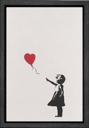 E qui, contraddittoriamente, non stiamo parlando di opere murarie ma di quadri, quelli che lo street artist snobba perché il suo fare artistico è tutto rivolto al sociale (?!!). Girl with balloon, 2006, quadretto di pittura spray di 101 x 78 x 18 cm, raggiunge 1,364,668 $ al Sotheby’s, Londra, il 05/10/2018. Le quotazioni adesso saranno ancora più alte per un quadretto, scusate la ripetizione, che sembra un gift di IKEA di pochi soldi. Una sagoma nera di bambina che tiene un palloncino rosso a forma di cuore rosso su un fondo bianco fatta con gli stencil: niente di più semplice e stupido, eppure ha una quotazione tanto alta che quadri come questo sono ovviamente diventati il miraggio professionale di tanti artisti.