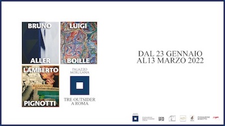 Al Palazzo Merulana è aperta fino al 13 marzo p.v. una mostra di tre pittori importanti: Bruno Aller, Lamberto Pignotti, Luigi Boille, artisti di percorso parallelo che hanno avuto nella figura di Bruno Aller il collegamento in quanto frequentatori della sua galleria. Curata dallo storico d’arte Stefano Gallo, la rassegna presenta in totale circa 60 opere di cui 6 in grandi formati, tra cui un’opera double face di Luigi Boille del 1958, due gonfaloni di Lamberto Pignotti esposti nel 2019 al Centre Pompidou di Parigi, una pala laica a paravento di Bruno Aller…