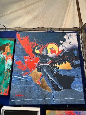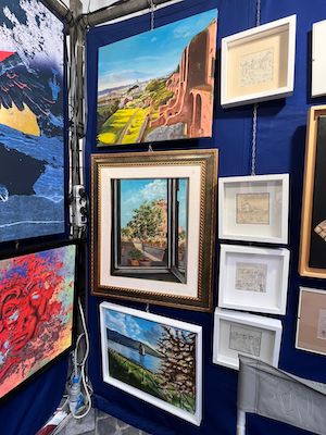 Dopo i saluti con l’artista Labianca e i ringraziamenti per la sua disponibilità, passo allo stand di Antonella Iris De Pascale, un’artista “tra il reale e il surreale” che inizia a raccontarmi di sé: “Mi posso definire l’artista dell’anima e il motivo è semplice: tutte le mie opere sono caratterizzate da figure volteggianti all’interno dello spazio del quadro. Io attingo dalla realtà, attraverso delle fotografie di luoghi e di persone. Molti dei miei quadri vengono da immagini scattate in Andalusia e Marocco. Spesso io stessa sono all’interno del palcoscenico del quadro. Io vedo in un vissuto, in una scena, in un luogo, qualcosa per creare una nuova narrazione. Prendo piccoli fotogrammi e piccole scene per creare un film: il film della vita. Per me esiste il concetto di anima, che è nelle persone, nei luoghi, negli eventi. È un invisibile che viene fuori, che emerge e che io tiro fuori a modo mio”.