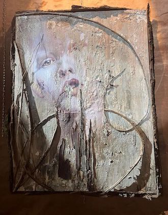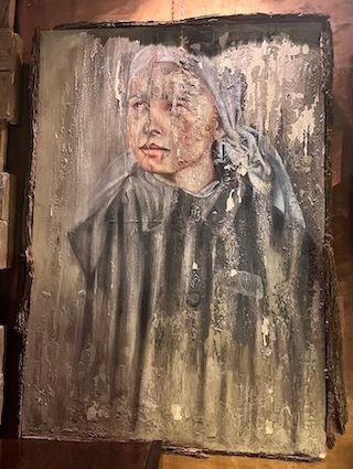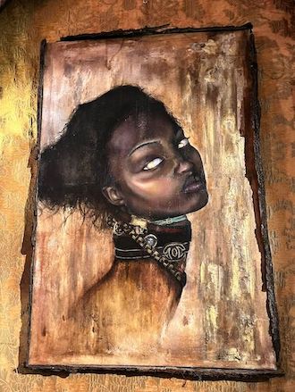 Mi spiega, poi, che il suo intento e il filo conduttore della sua arte è dare voce a chi non ne ha. “I soggetti, come dice il titolo della mostra, sono Anime Prive: anime che sono state o sono ancora dimenticate dalla società. È la mia critica sociale. Sarah” mi indica un quadro alle mie spalle, “è una bambina veramente esistita e tanti anni fa è morta… beh, per ingiustizia. Una donna schiavizzata e strumentalizzata, un’altra ingiustizia, è rappresentata nel quadro chiamato Afrika. Trasfiguro su tela quello che non mi va giù di questo mondo, come se fossero dei manifesti”.