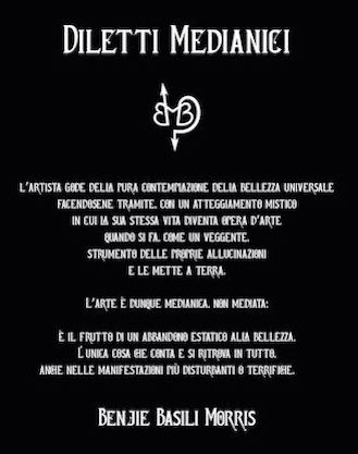 Venerdì 14 ottobre alle 19.00 presso la Sacripante Art Gallery di Roma si terrà il vernissage della mostra d'arte "Diletti Medianici" di Benjie Basili Morris, a cura di Elena Gradini, che sarà possibile visitare fino al 30 ottobre.
