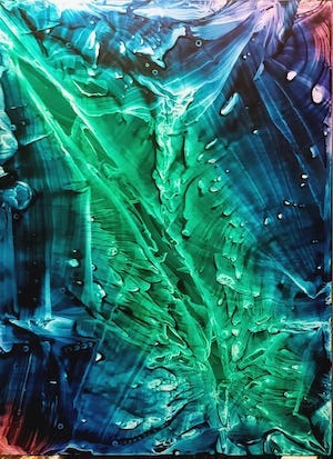 Non vediamo più il Mario Nalli che fluidifica la forma del colore in varie cinetiche pieghe sinuose dai riflessi accattivanti ma un nuovo personaggio che d’impeto trasforma la superficie in un conflitto di forme trascinato dal colore irruente e debordante che travolge la stessa tela che pare a malapena contenere, un dipinto a olio che ha una notevole forza dirompente.