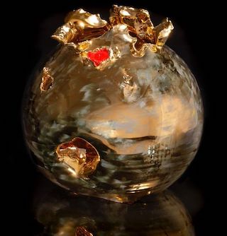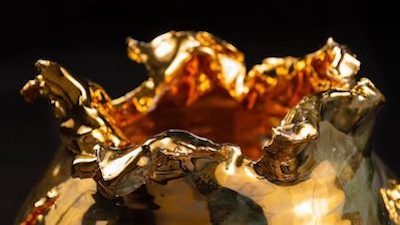 Ora al PAN c'è una mostra antologica, “Dalla Muraglia al Vesuvio”, che riassume il lavoro svolto per anni da Nicola. Feci la sua conoscenza al Museo Archeologico di Napoli, dove, nel 2015, venivano mostrati, su un velluto scuro, i Cosmic Bullets, i suoi lucenti grandi vasi di ceramica placcati d'oro e bucati in vario modo “da proiettili cosmici”- come mi disse. L'oro dei vasi di Rivelli – è stato detto - ha lo stesso valore nobilitante dell'oro nelle opere sacre bizantine e la rottura dei vasi è espressione del desiderio di liberazione da qualsiasi costrizione, finanche dalla stessa forma del vaso.