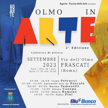 A Frascati (RM) è in corso la seconda edizione dell’esposizione collettiva diffusa su strada di pittura contemporanea, nella storica via commerciale dell’Olmo, curata dalla Galleria d’Arte e Associazione Culturale “Agarte — Fucina delle Arti”.
