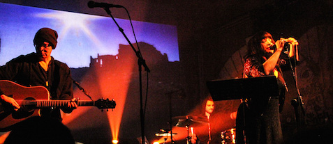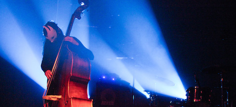 Sotto le arcate del Forte una folla tenace quanto infreddolita sembra aspettare, sospesa, l’inizio del concerto, l’evocazione finale degli spettri del folk urbano ma, proprio come un altro fantasma, dalla penombra appena squarciata da luci sulfuree emerge d’improvviso la contrabbassista romana Caterina Palazzi, leader della band Sudoku Killer, abbracciata al suo strumento come un naufrago a un relitto in una notte di tempesta, sola sul palco, le sembianze coperte da una maschera bianca, a presentarci il suo progetto solista ZALESKA (nome derivato dalla figlia illegittima del Conte Dracula), in cui ogni composizione musicale è ispirata ad un attore che ha interpretato il personaggio del conte transilvano al cinema, con una scaletta fatta di suoni dissonanti, stralci rumoristici al calor bianco inframmezzati da vaghe linee melodiche.
