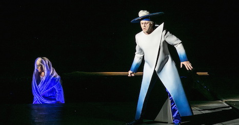 István Kovácsházi, un Sigfrido un po’ rasta dai lunghi dreeds, un po’ gigante buono, che indossa un abito da cacciatore (costumi di Ibolya Bárdosi) che ben concilia le due nature del personaggio. Subito dopo è la volta di un Wotan (il basso  Egils Silins), austero nella candida tunica e profondo nel timbro vocale.