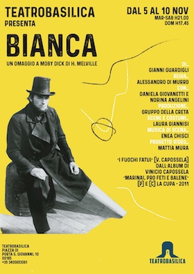 A duecento anni dalla nascita di Herman Melville si desidera ricordare il genio americano attraverso il romanzo sicuramente più celebre e celebrato dell’autore: Moby Dick o la balena. Dopo il debutto ai Solisti del teatro e la suggestiva messa in scena sulla spiaggia di Riccione, proprio davanti all’altro grande protagonista del racconto, il mare, BIANCA, di Gianni Guardigli, per la regia di Alessandro Di Murro, con Daniela Giovanetti e Norina Angelini, debutterà al TeatroBasilica mercoledì 6 novembre (ore 21.00).