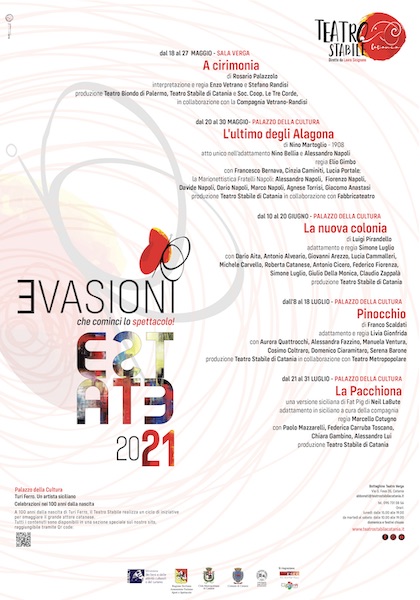 «Se abbiamo chiamato questo nuovo cartellone Evasioni è proprio per dichiarare che il Teatro ci consente di ritrovarci final- mente in uno spazio fisico e simbolico diverso da quello in cui siamo stati costretti in questi mesi, liberando lo sguardo e le idee. Il teatro non esiste senza pubblico e - crediamo - non è civile una società senza teatro. Ritornare ad incontrarci dal vivo è la missione del nostro lavoro e speriamo di esservi mancati tanto quanto voi siete mancati a noi», conclude Sicignano: «Il programma a cui assisterete al Teatro Verga e nella splendida cornice della Corte Mariella Lo Giudice di Palazzo della Cultura, è stato preparato in questi mesi ‘a porte chiuse’, seguendo il filo rosso che intende valorizzare i nuovi talenti siciliani e un'idea di Sicilia contemporanea, originale e piena di vitalità. Oltre a questi spettacoli, in questi mesi abbiamo lavorato alla produzione di Baccanti, che riprenderà presto la tournée, e a quella di altri lavori ispirati proprio dal tempo presente, come Tornati a casa per tempo, diretto da Nicola Alberto Orofino, e Una fuga in Egitto, diretto da Turi Zinna, che siamo pronti a portare in scena da settembre quando annunceremo i dettagli della Stagione 2021/2022, che abbiamo già messo a punto fino a maggio 2022».