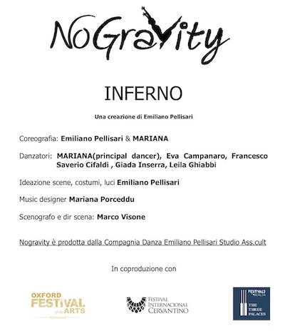 I suoi ballerini, liberi dalla forza di gravità, fluttuano nell’aria al ritmo della musica che spazia dal rock alla musica classica. Ispirato ai più famosi canti di Dante, che coinvolge Escher e Magritte nel loro universo surrealista, Pellisari conduce il pubblico in un sogno ad occhi aperti di straordinaria bellezza”