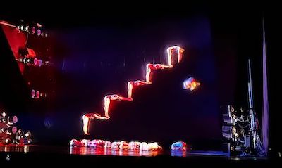 Ci vuole qualche attimo per  superare la sensazione di confusione e rendersi conto che, sopra al palco, troneggia un enorme specchio che permetterà una visione innovativa di uno spettacolo incredibile, la promessa di qualcosa d’indimenticabile.