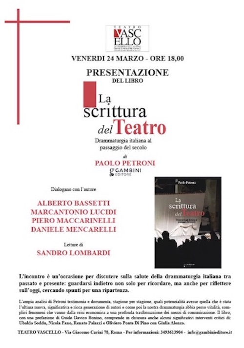 Venerdì 24 marzo alle ore 18, presso il Teatro Vascello di Roma, la presentazione del libro di Paolo Petroni: “La scrittura del Teatro, drammaturgia italiana al passaggio del secolo” (Gambini editore).