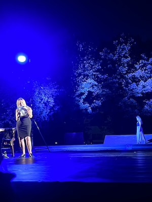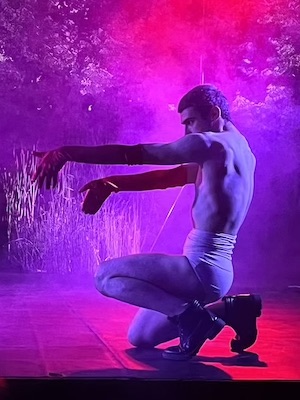 Nel blu delle luci di scena, con un’atmosfera molto diversa, inizia a recitare Marilù Prati che legge una parte del diario di Vaclav Nižinski sulla sua esperienza alla Scuola di Ballo Imperiale di San Pietrburgo, compreso il bullismo subito per essere il più bravo.