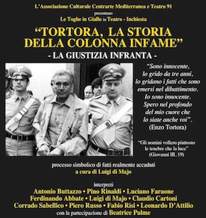Nell’ambito della XXVI Edizione de “i Soliti del Teatro” che si svolge ai Giardini della Filarmonica in via Flaminia a Roma (12 luglio / 4 settembre 2019), martedì 16 luglio vi è stata la rappresentazione teatrale “Tortora, la storia della colonna infame – la Giustizia infranta”, testo e regia dell’avvocato Luigi di Majo… Giudici e Avvocati hanno messo in scena la drammatica vicenda del processo a Enzo Tortora, arrestato e condannato a dieci anni di reclusione dalla Corte di Assise di Napoli il 17 settembre 1985.In seguito all'arresto e alla condanna fu poi assolto per palese errore giudiziario. Enzo Tortora ha subito una grave ferita psichica e fisica che lo ha condotto alla morte il 18 maggio 1988.