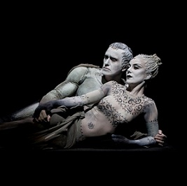 Un palcoscenico in verticale: uno schermo digitale enorme, tutto grigio, grande come il sipario intero. Vi appaiono e vi si muovono personaggi dal colore di pietra, di una pietra imbevuta di luce: parlanti sculture marmoree. Monumenti, ricordi imperituri di un antico avvenimento epocale, lo scontro tra Oriente e Occidente. di Adriana Dragoni