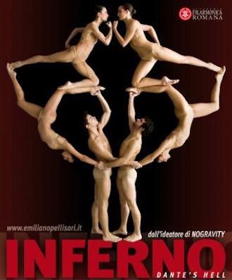 In occasione delle celebrazioni dantesche per i 700 anni, danzatori, atleti e acrobati sfidano la gravità ed immagini straordinarie appaiono dal buio, un mondo dove il reale e il virtuale si mischiano in un caleidoscopio di immagini sorprendenti tratte dalle immagini più forti dantesche. Un inferno paradossale come Escher, assurdo come Magritte, crudelmente caravaggesco. Uno spettacolo dove il disegno della luce, la musica e l’illusione si coniugano con la danza, l’atletica circense e la mimica. Dal 17 al 20 marzo al Teatro Olimpico di Roma (ore 21), Inferno, lo show della NoGravity.