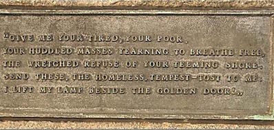 Sulla base della Statua della Libertà a New York sono incise i seguenti versi di Emma Lazarus: “Give me your tired, your poor, your huddled masses yearning to breathe free, the wretched refuse of your teeming shore. Send these, the homeless, tempest-tossed to me, I lift my lamp beside the golden door!”(Datemi le vostre stanche, povere, masse infreddolite desiderose di respirare libere, i rifiuti miserabili delle vostre coste affollate. Mandatemi i senzatetto, gli scossi dalle tempeste e io solleverò la mia fiaccola accanto alla porta dorata).