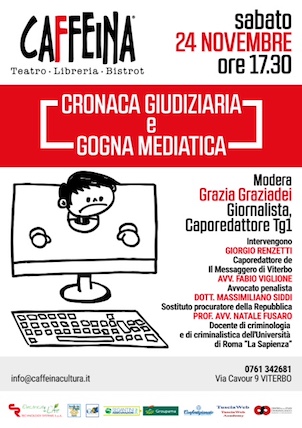 “… La giustizia, come recita la costituzione, viene amministrata in nome del popolo italiano. In questo senso, tuttavia, vanno distinte le attività di corretta ed equilibrata informazione in ambito giudiziario da forme di spettacolarizzazione della notizia che finiscono per non rispettare neanche il principio di presunzione di non colpevolezza, parimenti di radice costituzionale… - cosìl’avvocato Fabio Viglionenel suo intervento a Viterbo nel corso del convegno Cronaca giudiziaria e gogna mediatica tenutosi a Viterbo nel salotto del teatro-libreria “Caffeina”.