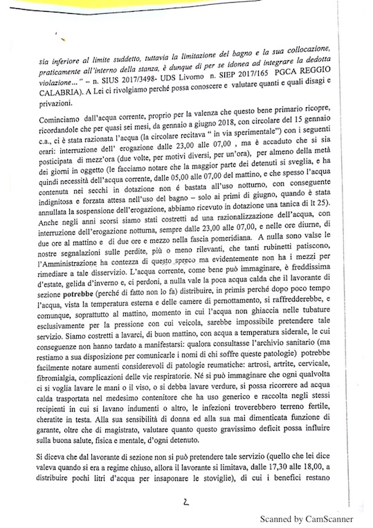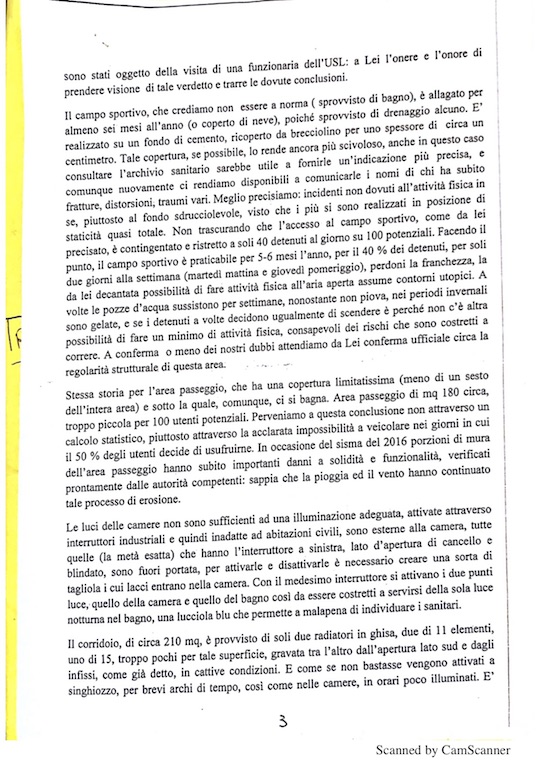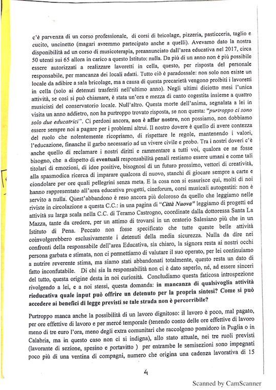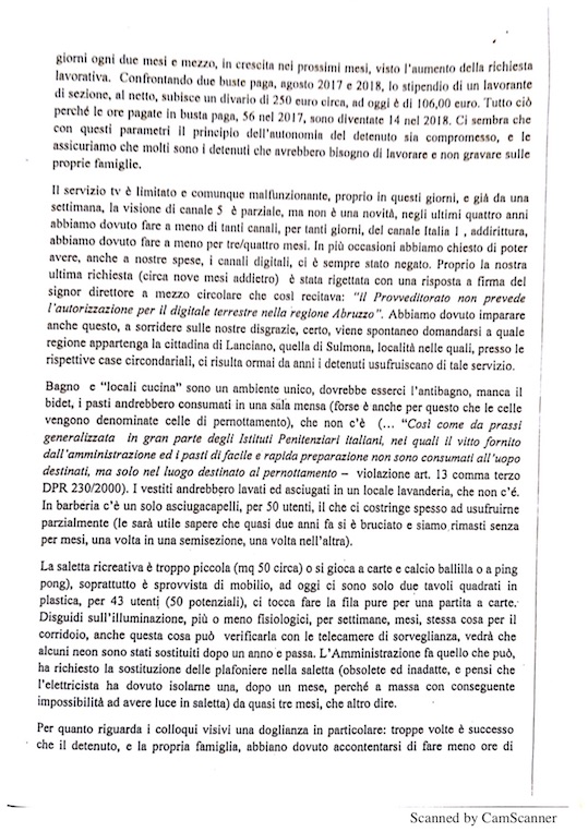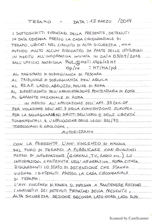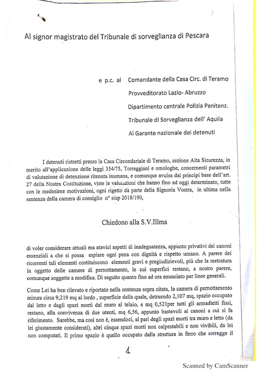 i detenuti della casa circondariale di Teramo, sezione «alta sicurezza», il 3 settembre 2018 hanno inviato una lettera-denuncia indirizzata al magistrato di sorveglianza di Pescara, e, per conoscenza, al comandante della casa circondariale, al provveditorato Lazio Abruzzo, al dipartimento centrale di polizia penitenziaria, al tribunale di sorveglianza de L'Aquila e al Garante nazionale dei detenuti, recentemente diffusa dal legale incaricato avvocato Vincenzo Di Nanna del foro di Teramo, in cui si sottolineano elementi d'inadeguatezza nelle condizioni della struttura suddetta;