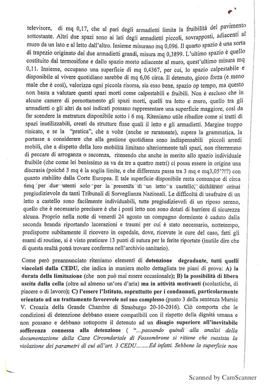 in base a quanto rappresentato il sovraffollamento nel carcere sarebbe tale che lo spazio calpestabile e disponibile al vivere quotidiano sarebbe di 6,06 metri quadri circa; inoltre, si ravvisa una violazione dell'articolo 3 Convenzione europea per la salvaguardia dei diritti dell'uomo e delle libertà fondamentali;