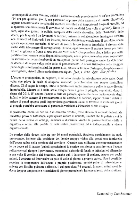 In una lunga nota di denunzia, che Di Nanna ha inoltrato al magistrato del Tribunale di sorveglianza di Pescara e per conoscenza al Comandante della casa Circ. di Teramo, Provveditorato Lazio-Abruzzo, al Dipartimento centrale Polizia Penitenziaria, al Tribuale di sorveglianza dell’Aquila, al Garante nazionale dei detenuti, si segnalavano le drammatiche condizioni della struttura penitenziaria.