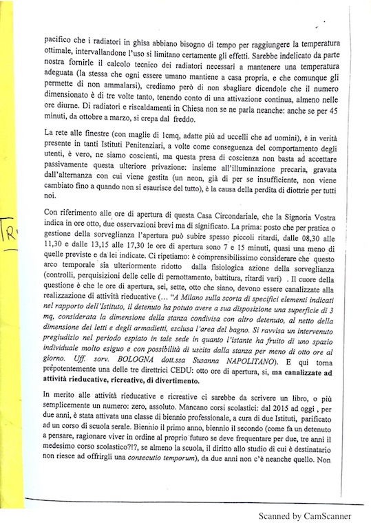 “Qualora la situazione dovesse perdurare, calcolando che in presenza della violazione dell’art. 3 CEDU il risarcimento per ciascun detenuto è pari a 8 euro per ogni giorno di carcerazione illegale, se moltiplichiamo la cifra per 365 e 430 (quanti sono ristretti nel carcere di Teramo) otteniamo, solo per un anno, un costo pari a 1.250.600 euro: oltre alla già grave violazione dei diritti umani, abbiamo quindi anche un danno all’erario”.