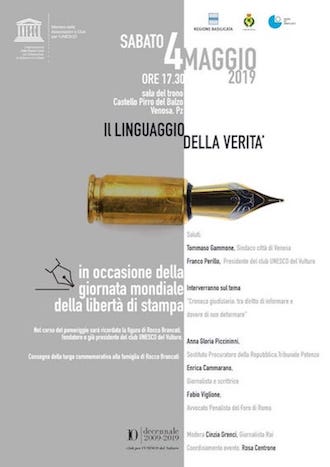 Il linguaggio della verità è il titolo del convegno che si è tenuto sabato 4 maggio, presso la Sala del trono del Castello Pirro del Balzo a Venosa. Il convegno - promosso con l’Unesco, la Regione Basilicata, la Città di Venosa e l’Ordine dei Giornalisti - è stato organizzato dal Club per l’Unesco del Vulture, nell’ambito delle attività per la celebrazione del decennale della propria costituzione ed in occasione della giornata mondiale della libertà di stampa.