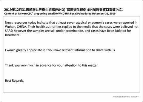 2. Grazie alla sua esperienza con l'epidemia di SARS nel 2003, Taiwan ha tenuto costantemente traccia delle informazioni sulla nuova epidemia. Il 31 dicembre 2019, Taiwan ha inviato un'e-mail al punto focale del Regolamento sanitario internazionale (IHR) sotto l'Organizzazione mondiale della sanità (OMS), informando l'OMS della sua comprensione della malattia e chiedendo anche ulteriori informazioni all'OMS. Data la mancanza di chiarezza al momento, così come le numerose voci che circolavano, l'obiettivo di Taiwan era quello di garantire che tutte le parti interessate rimanessero vigili , soprattutto perché l'epidemia si è verificata poco prima delle vacanze del capodanno lunare, che in genere vedono enormi quantità di viaggi. Per essere prudenti, nell'e-mail ci siamo preoccupati di fare riferimento alla polmonite atipica e in particolare abbiamo notato che i pazienti erano stati isolati per il trattamento. gli operatori sanitari potevano desumere da questa formulazione che esisteva una reale possibilità di trasmissione della malattia da uomo a uomo, tuttavia, poiché all'epoca non vi erano ancora casi della malattia a Taiwan, non abbiamo potuto affermare direttamente e conclusivamente che vi fosse stata una trasmissione da uomo a uomo.