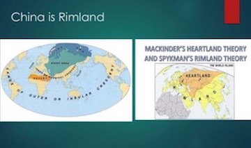 [19] All'inizio del XX secolo, Mackinder aveva questa formula, per spiegare come funziona il potere nella geopolitica: "Chi controlla l'Europa orientale, controlla Heartland; chi controlla Heartland, governa il mondo". Poi, a metà del XX secolo, quando l'importanza di Rimland venne compresa, Spykman trasformò questa formula geopolitica: "Chi controlla Rimland, controlla Heartland; chi controlla Heartland, governa il mondo".