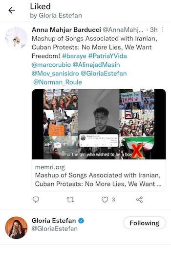 Gloria Estefan, la cantante cubana che nella sua trentennale carriera ha venduto più di 100 milioni di dischi in tutto il mondo, ha inviato a Anna Mahjar-Barducci, che ha rilanciato il video tramite il sito del Memri e poi di Agenzia Radicale, un suo like di sostegno…