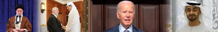 Da sinistra a destra: il leader supremo iraniano Ali Khamenei, il leader di Hamas Ismail Haniyeh, l'emiro del Qatar Tamim bin Hamad Al Thani, il presidente degli Stati Uniti Joe Biden e il presidente degli Emirati Arabi Uniti Mohamed bin Zayed Al-Nahyan