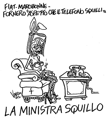 Vogliamo dirla tutta: la vignetta di Vauro sulla “ministra squillo” in attesa che arrivi la telefonata di Sergio Marchionne è dal punto di vista satirico scadente. Nella migliore delle ipotesi non è la più riuscita, il che non capita di rado, del vignattista preferito da Michele Santoro. Ma come talvolta accade, le cose peggiori sono quelle che hanno maggior successo.