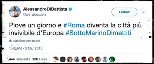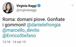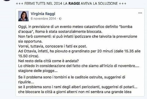 Non a caso Raggi scriveva che “se il problema sono i tombini e le caditoie ostruite suggerirei di ripulirle....se il problema sono i rami degli alberi pericolanti, suggerirei di potarli...” Correva il 6 novembre 2014.