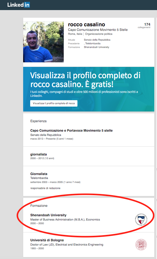 Va da sé, un po' di fuffa nei "biglietti" di presentazione non si nega a nessuno, va messa in conto e può essere anche tollerato. A patto che non si esageri. Tanto poi i fatti sono quelli che contano. E i fatti ci dicono che Rocco Casalino – abile e capace stratega della comunicazione pentastellata – non ha oggi bisogno di abbellire la sua carriera, magari con un master tarocco in "business administration" presso un'Università americana.