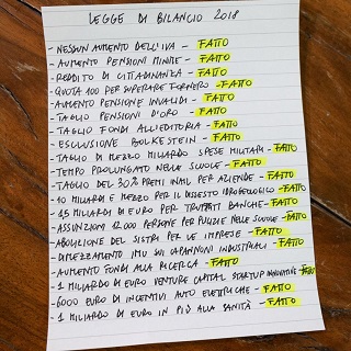 Non solo: Luigi Di Maio è voluto andare più nel dettaglio, presentando una lista della spesa scritta a mano e spuntata con la parola magica Fatto, dalla quale arriva la conferma della strategia comunicativa basata sullo schema collaudato, risultato vincente in campagna elettorale e nel corso di questa estenuante luna di miele con una bella fetta di italiani.